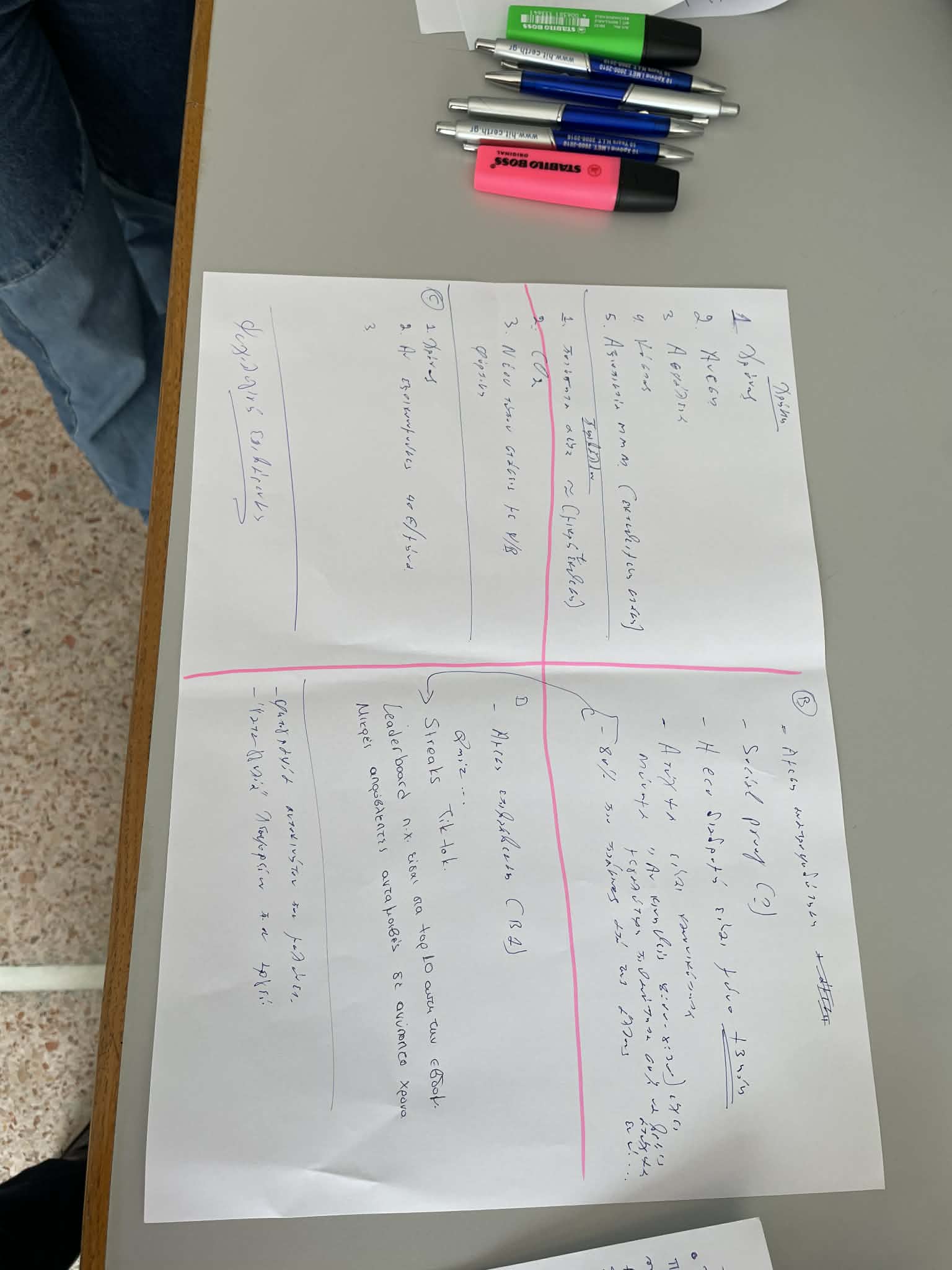 B. Brainstorming user needs In small groups, students explored how the application could better serve different mobility profiles and daily routines. Discussions ranged from the needs of students commuting across campus, to workers navigating high-traffic corridors, to cyclists looking for safer, less-polluted routes. Four key themes guided the conversation: routing options, nudging strategies, “What if” scenarios, and gamification mechanics.